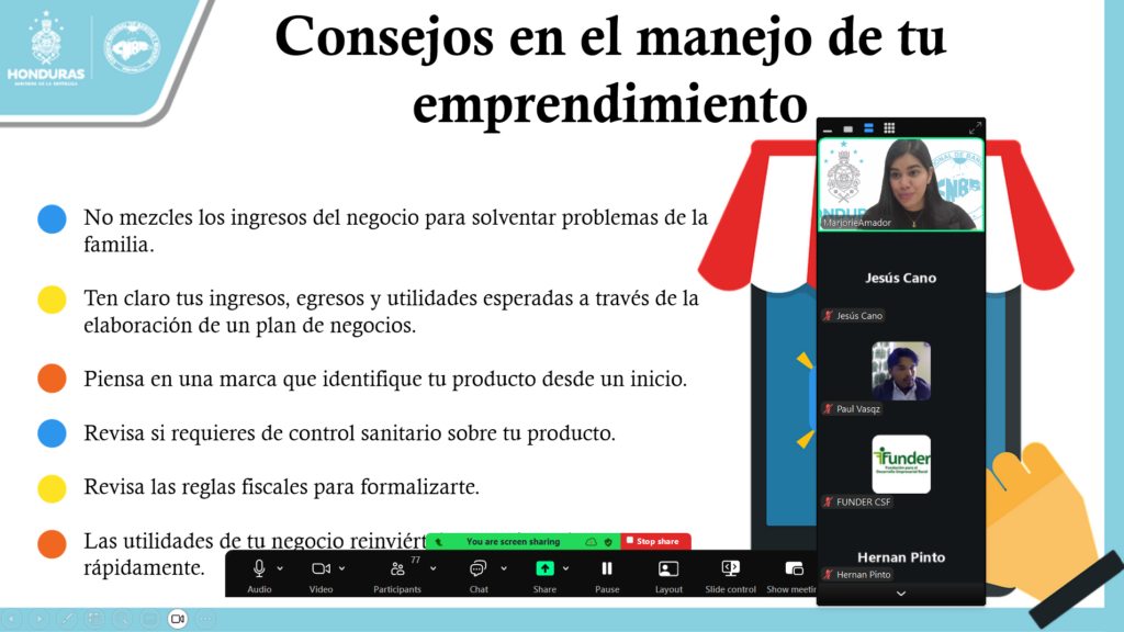 Se agradeció la participación de la CNBS en dicha jornada de capacitación, impartidas por el Licenciado Samir Hasbun de la Gerencia de Educación e Inclusión Financiera y Género.