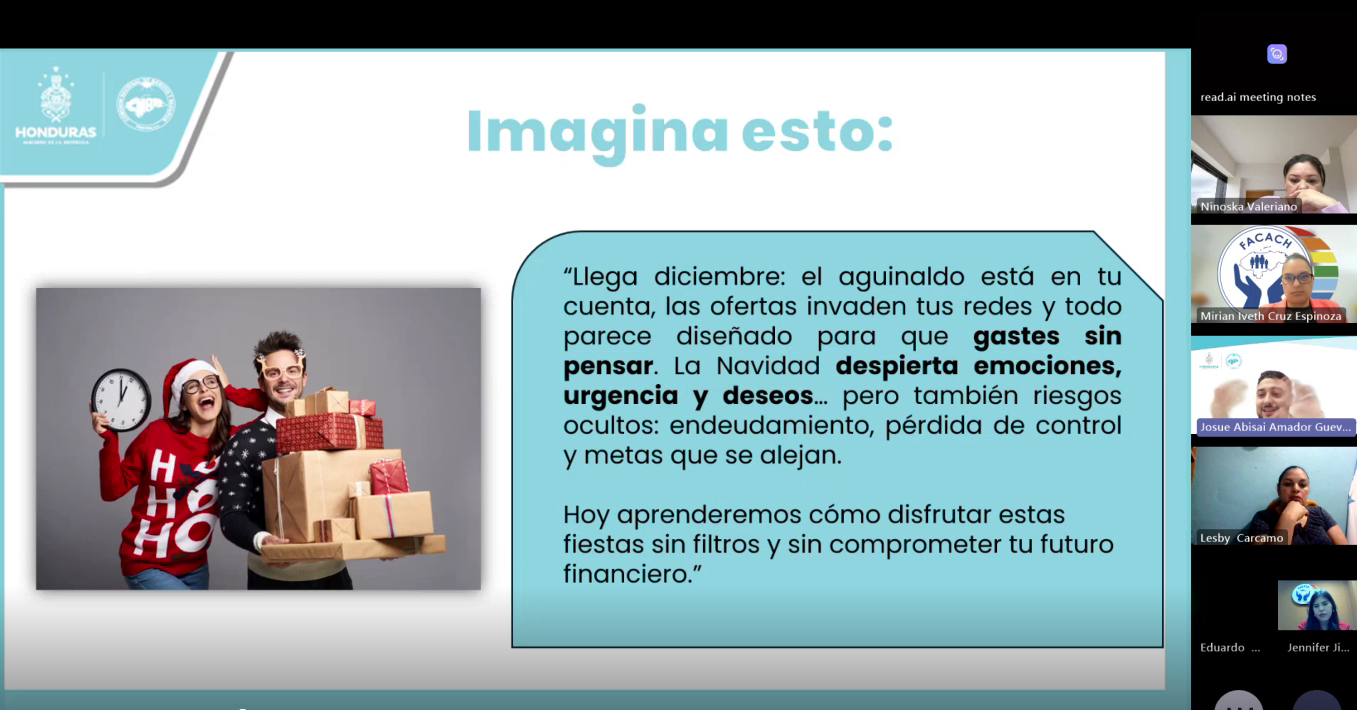 La Comisión Nacional de Bancos y Seguros (CNBS), reafirmando su compromiso con la educación financiera y el desarrollo sostenible, desarrolló el pasado 9 y 17 de diciembre de 2025, dos webinars dirigidos al público en general, con las temáticas : “Finanzas conscientes en temporada navideña” y “Navidad sin filtros: decisiones que cuidan tu dinero”, contando con la participación de 1,016 personas.