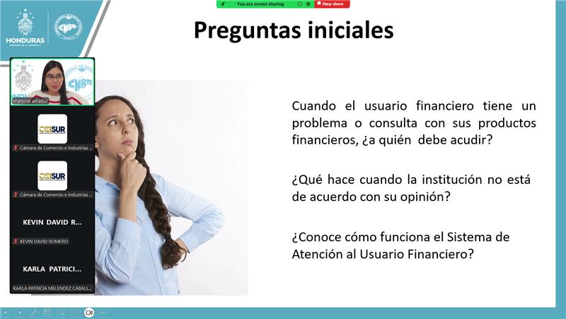 El pasado 14 y 21 de enero, la Comisión Nacional de Bancos y Seguros (CNBS) brindó capacitaciones virtuales sobre los temas “Mi Emprendimiento” y “Asegurando Tu Negocio”, a emprendedoras(es) afiliadas(os) a la Cámara de Comercio e Industrias del Sur (CCISUR), con una asistencia de 40 personas.