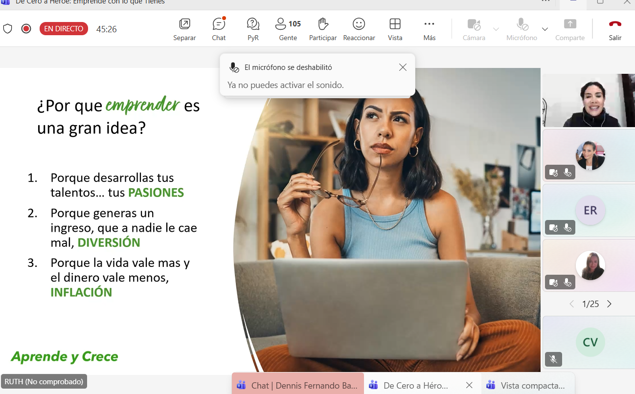 En complemento a este enfoque, las y los participantes aprendieron a identificar oportunidades de negocio con mínima inversión, aprovechando sus habilidades y recursos disponibles. Este enfoque permitió romper el mito de que “se necesita mucho dinero para emprender”, mostrando cómo validar ideas rápidamente, utilizar herramientas gratuitas y monetizar conocimientos sin incurrir en altos costos.